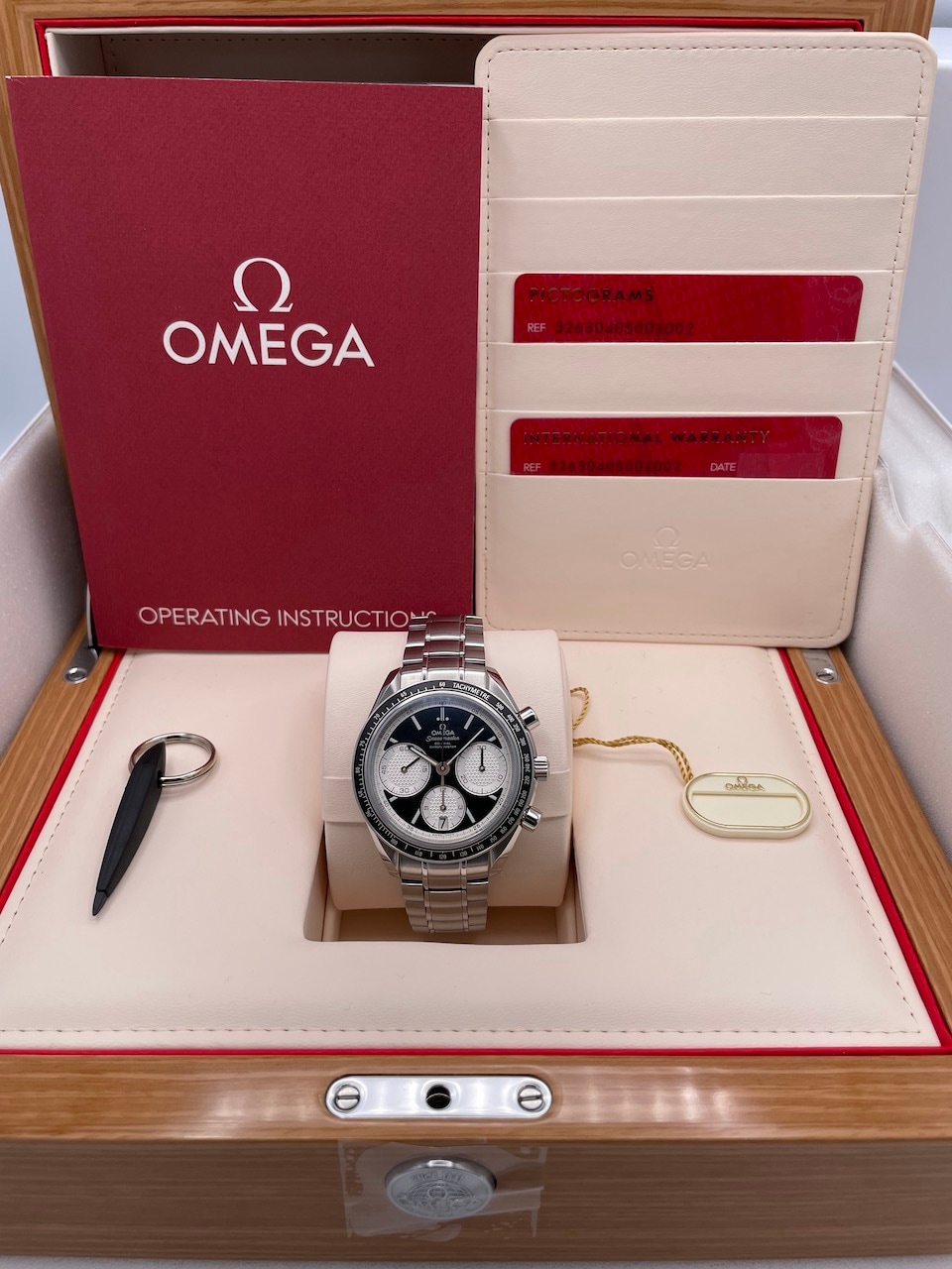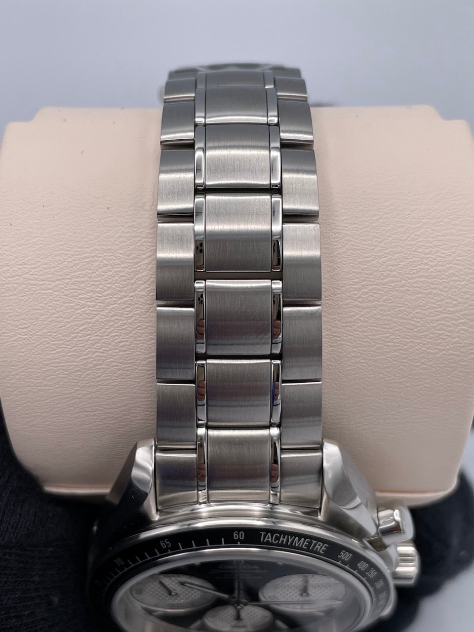 クル・ド・パリ装飾が施されたインダイヤルは通常のスピードマスターより大型化されており、3時位置に30分積算計、6時位置に12時間積算計と日付表示、9時位置にスモールセコンド秒針を備え、ムーブメントはSi14シリコン製ヒゲゼンマイを採用したフリースプラングテンプのCal.3330を搭載。