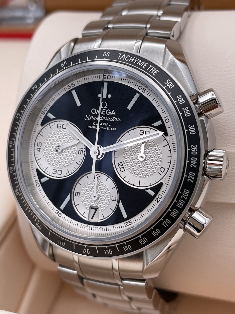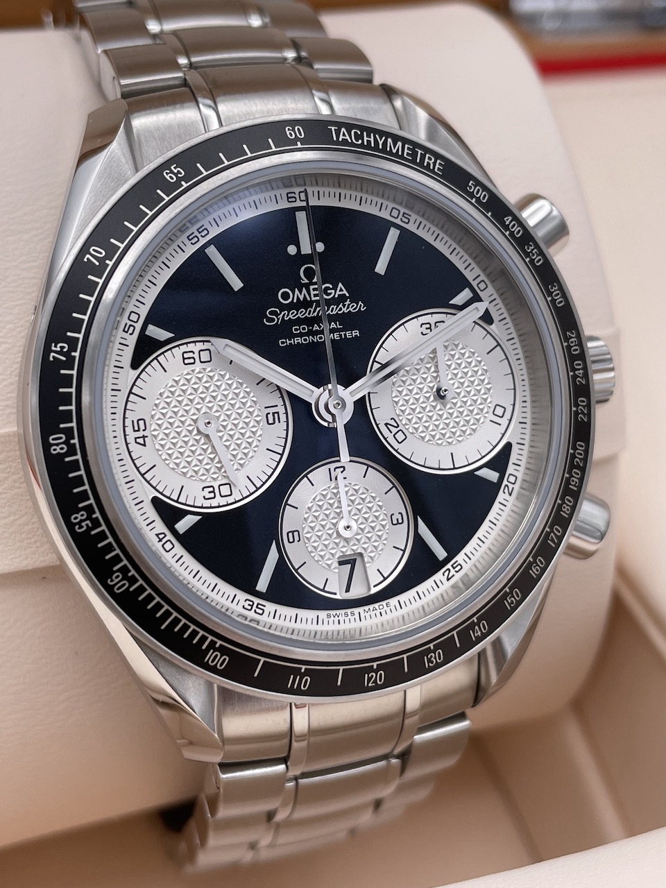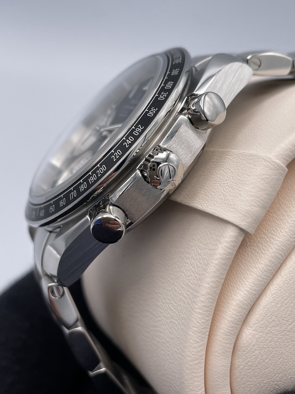 こちらのスピードマスター レーシングは2012年の発売から現在に至るまで人気のモデルでケース径40mmの使いやすい大きさとなっております。