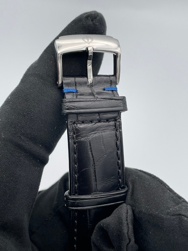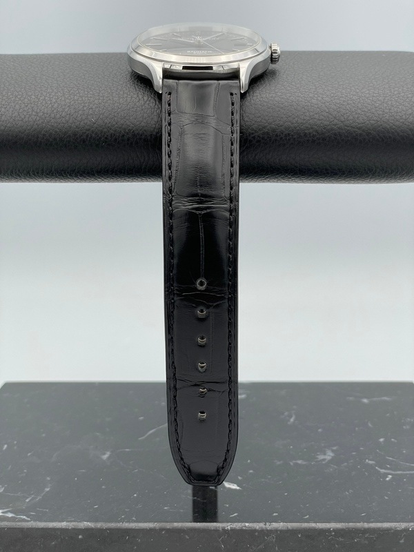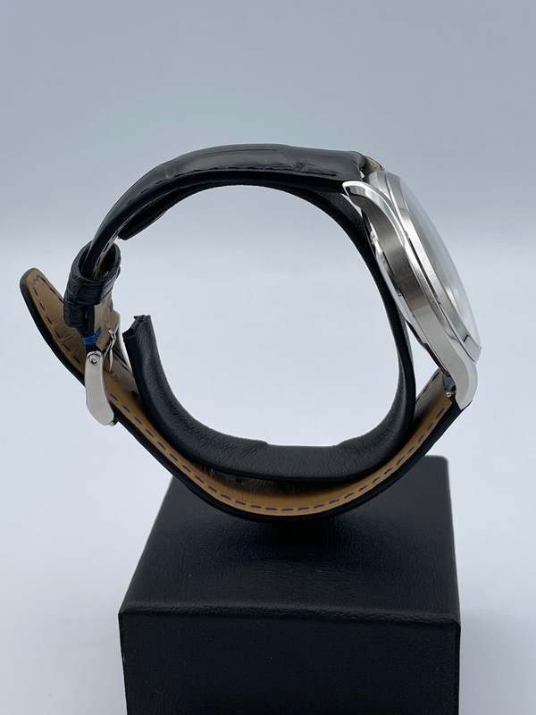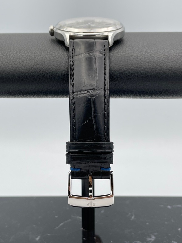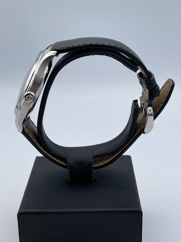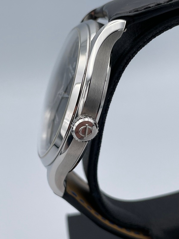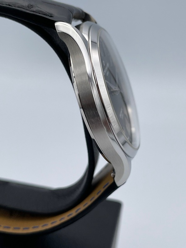40ミリのステンレススティール製のケースに黒文字盤と、控えめでシンプルながらエレガントなデザインが特徴です。