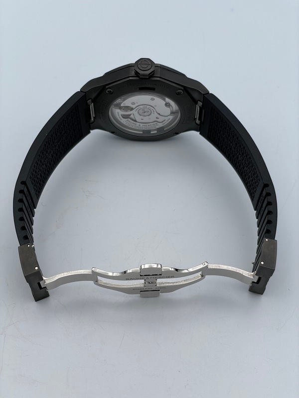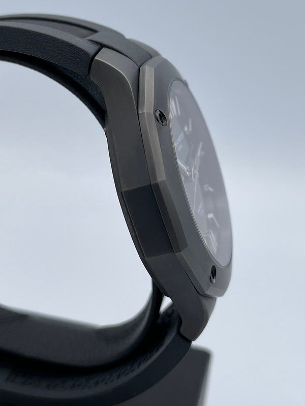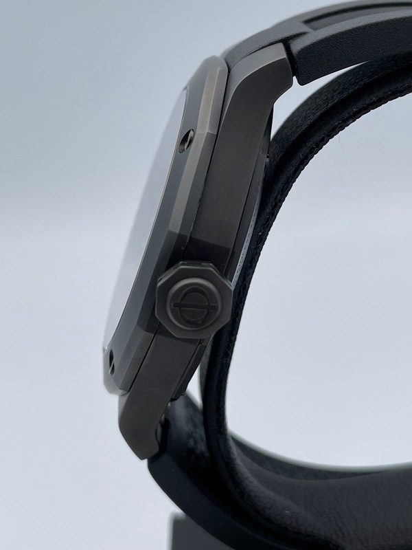12角形のベゼルに4本のビスが入った特徴的なベゼルに、スモークサファイアグレーのダイヤル、ブラックのADLC加工が施されたステンレススティールのケースにブラックのラバーストラップと、モダンに進化を遂げ洗練された仕上がりとなっています。