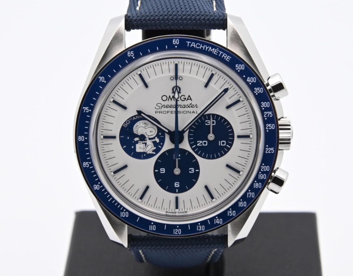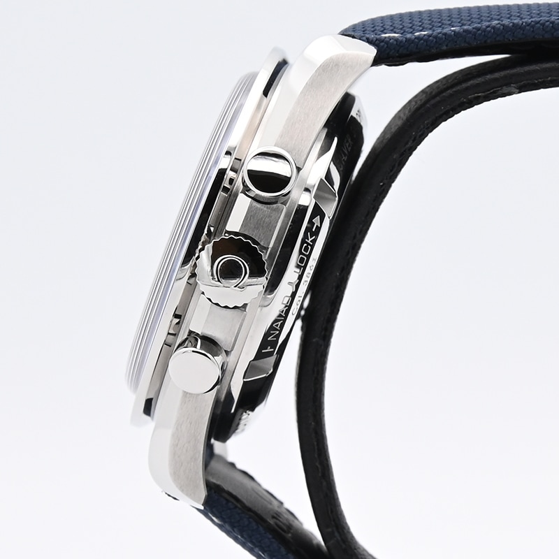 シルバーのダイヤルにはブルーPVDのインデックスと針を配し、9時位置のサブダイヤルには宇宙服を着たスヌーピーのメダリオンがあしらわれています。