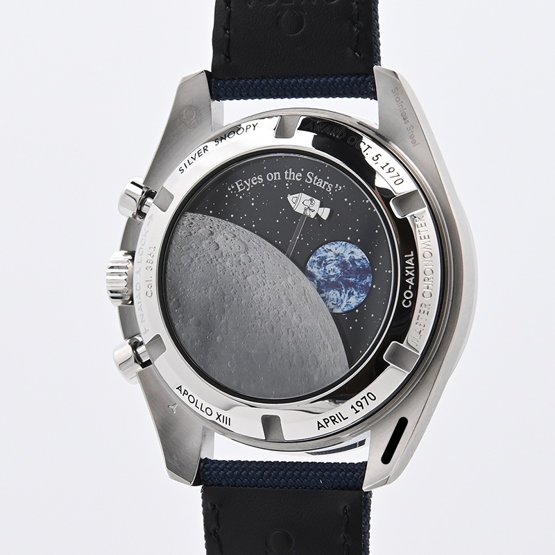 ケースバックは月の裏側と地球が描かれており、クロノグラフを始動すると指令機械船に乗ったスヌーピーが周遊する様子を眺めることが出来ます。