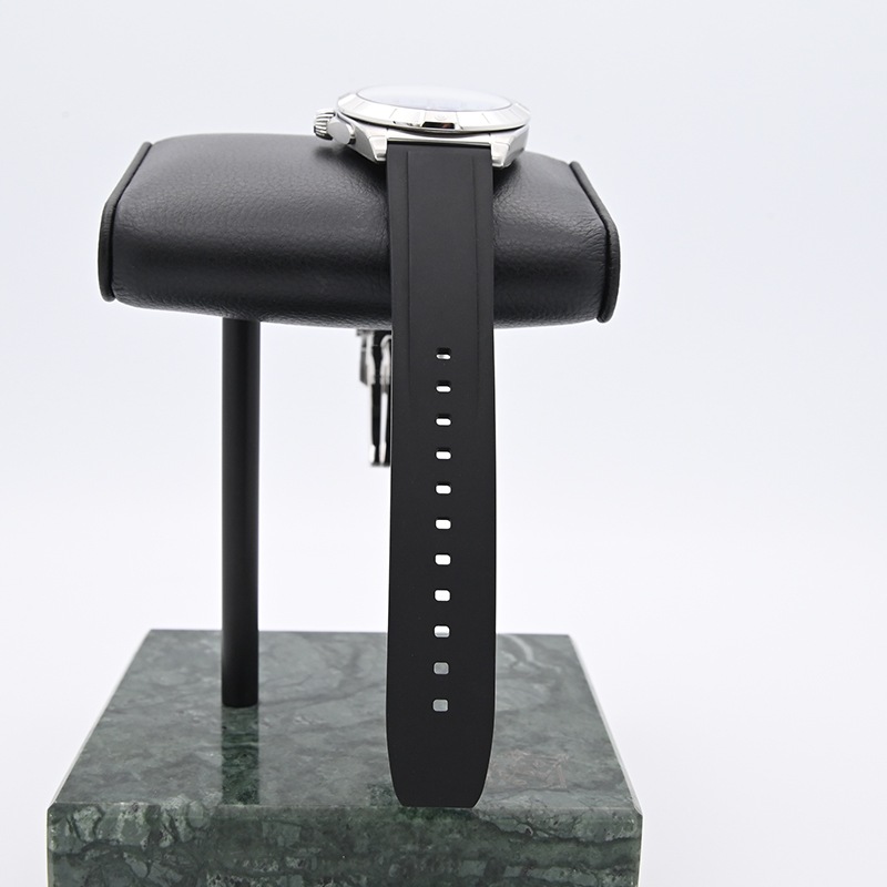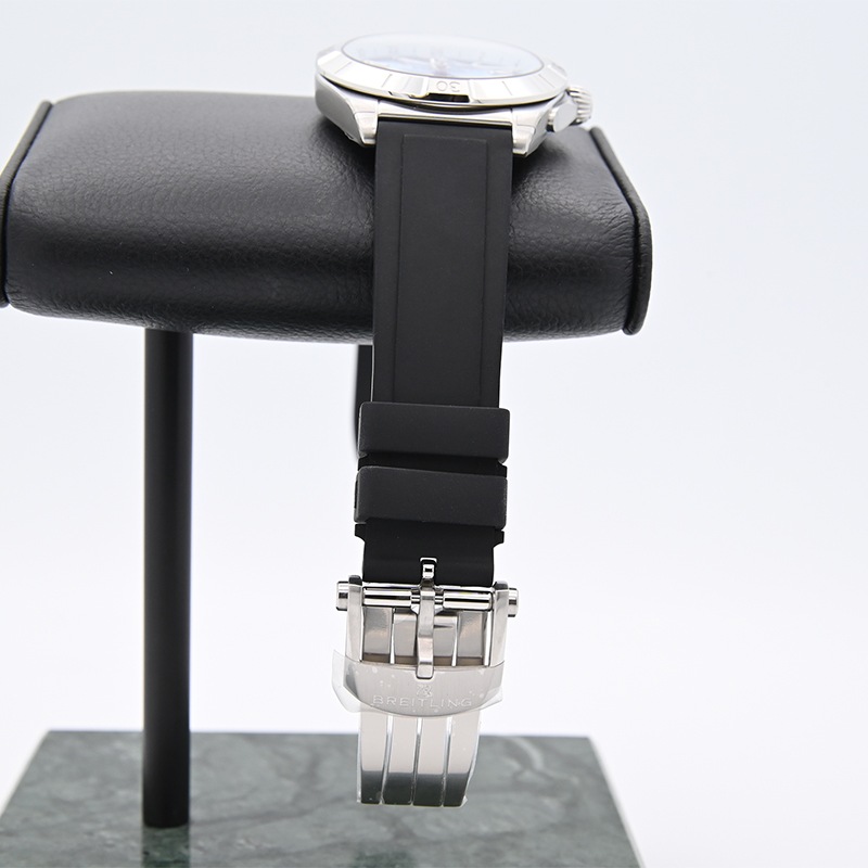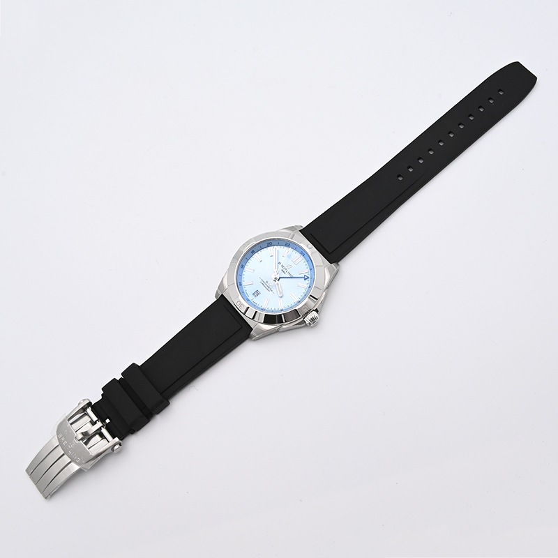 サンレイ仕上げのアイスブルーダイヤルにラバーストラップを採用したスポーティながら高級感溢れるモデルとなっています。