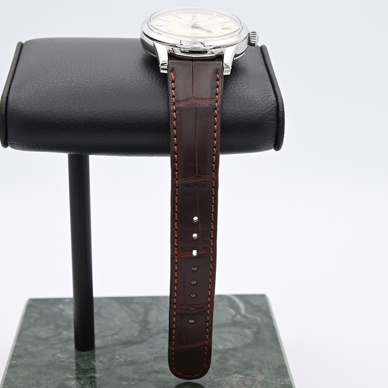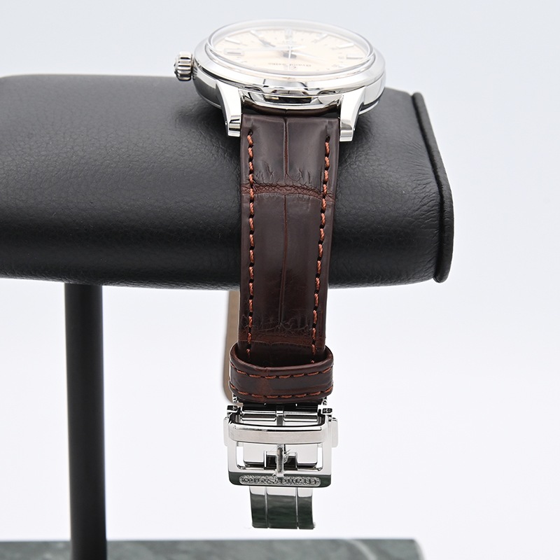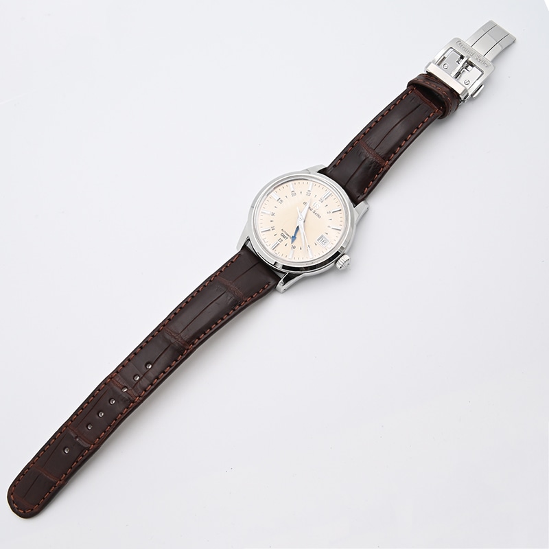 ケース径は39.5mmでボックス型のサファイアガラスを採用、味わい深いアイボリー文字盤に青いGMT針、ブラウンのレザーストラップなどクラシックなスタイルながら洗練された印象のモデルとなります。