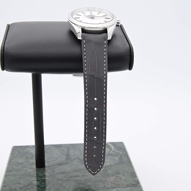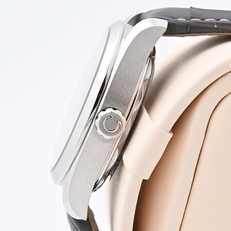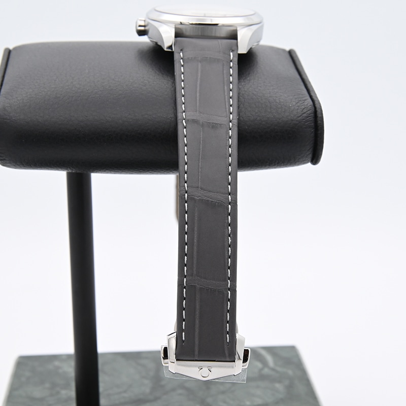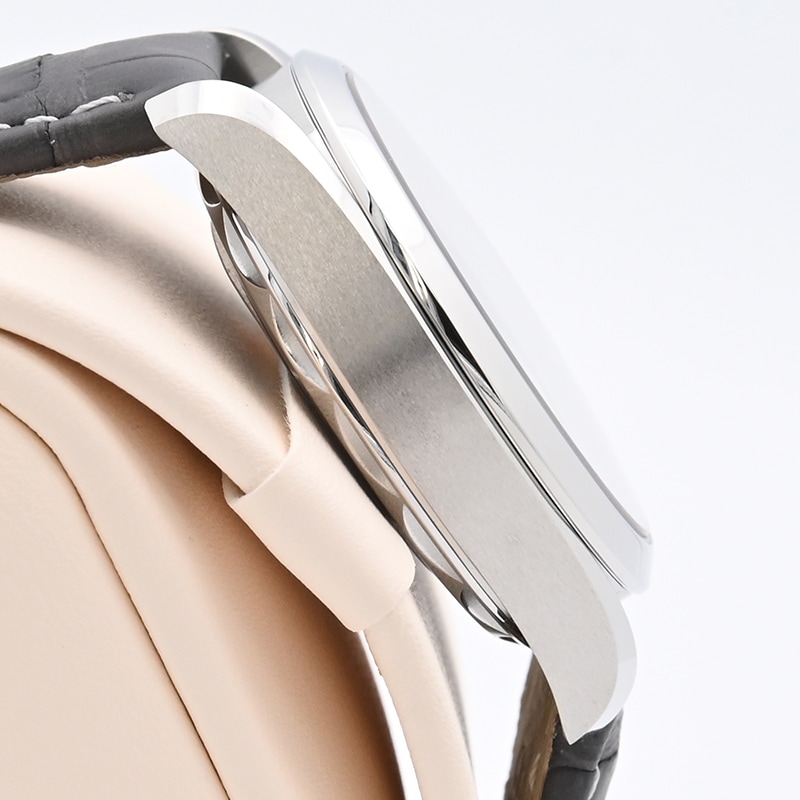 シルバーダイヤルにグレーのレザーストラップがシックな印象で、ビジネスシーンやカジュアルなスタイルなど様々な場面で着用いただけます。