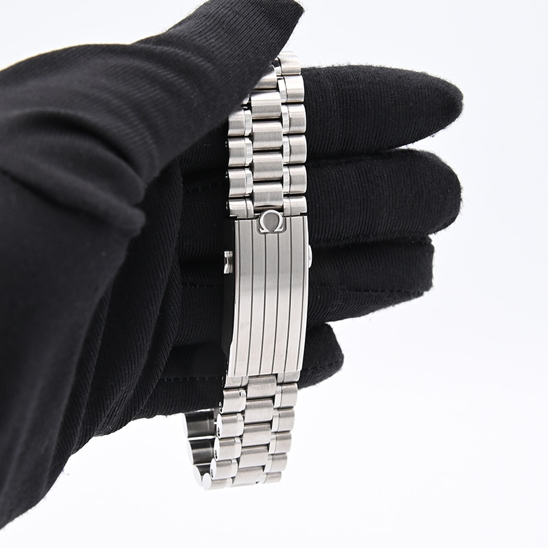 ケース径は42mm、ホワイトラッカー仕上げのダイヤルに、段差のあるステップダイヤル、オメガロゴやインデックスはアプライドタイプを採用。