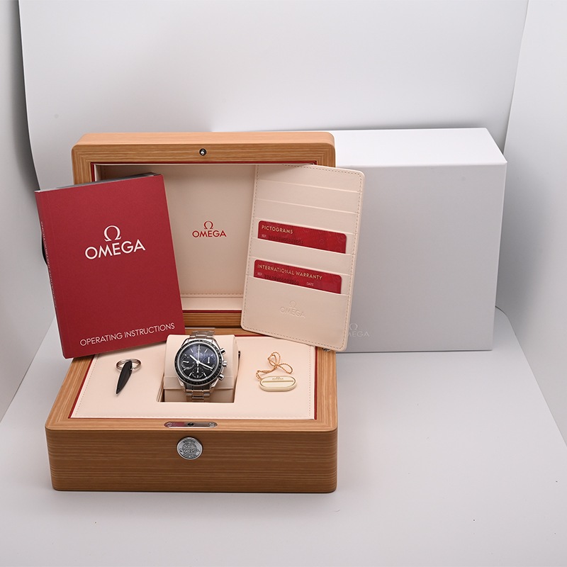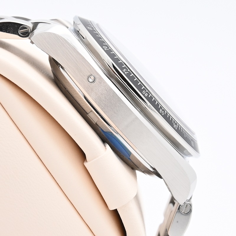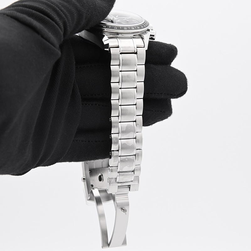 クル・ド・パリ装飾が施されたインダイヤルは通常のスピードマスターより大型化されており、3時位置に30分積算計、6時位置に12時間積算計と日付表示、9時位置にスモールセコンド秒針を備え、ムーブメントはSi14シリコン製ヒゲゼンマイを採用したフリースプラングテンプのCal.3330を搭載。
