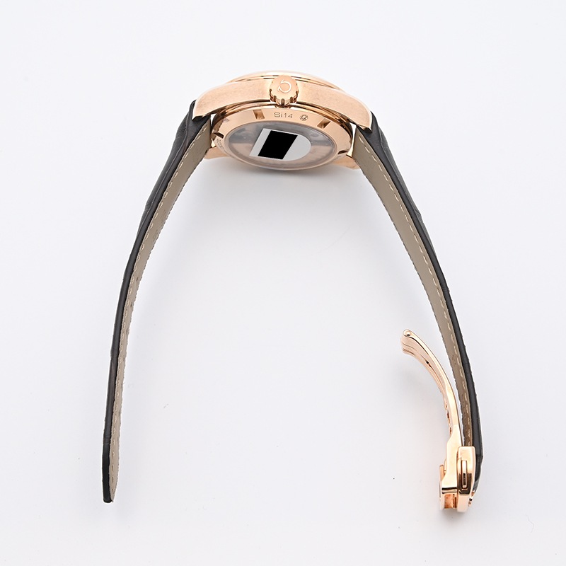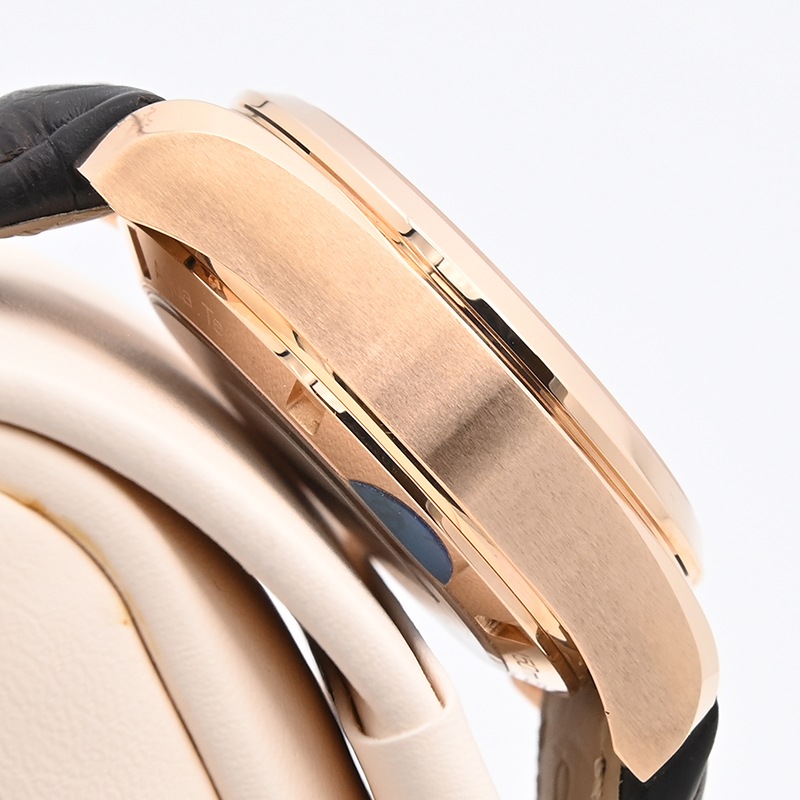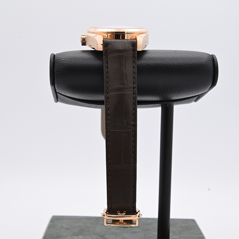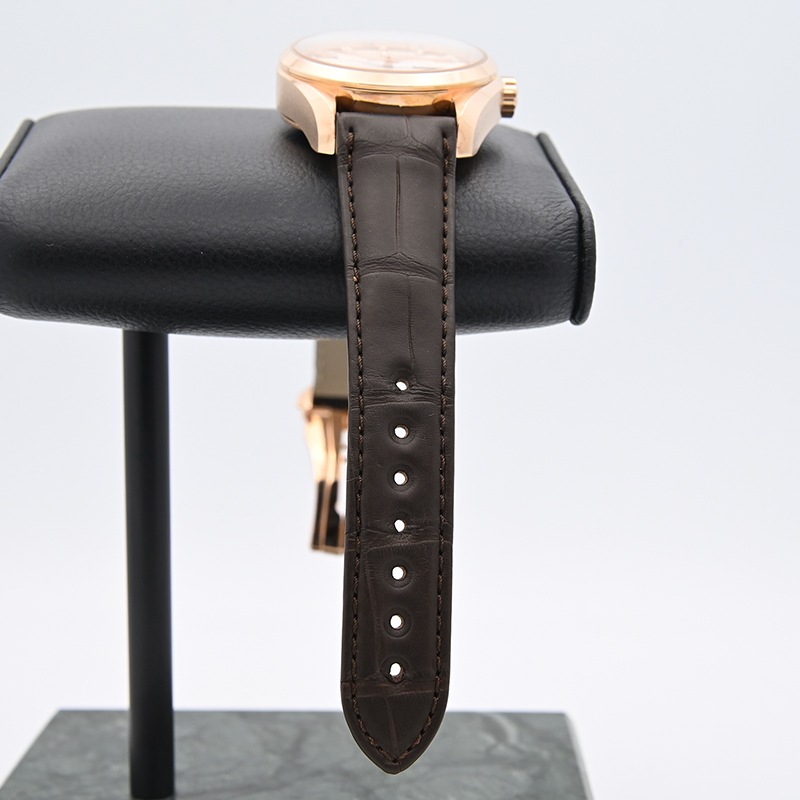 すっきりとしたシルバーダイヤルに18Kレッドゴールド製の金無垢ケースにブラウンのレザーストラップがマッチしたおすすめモデルです。