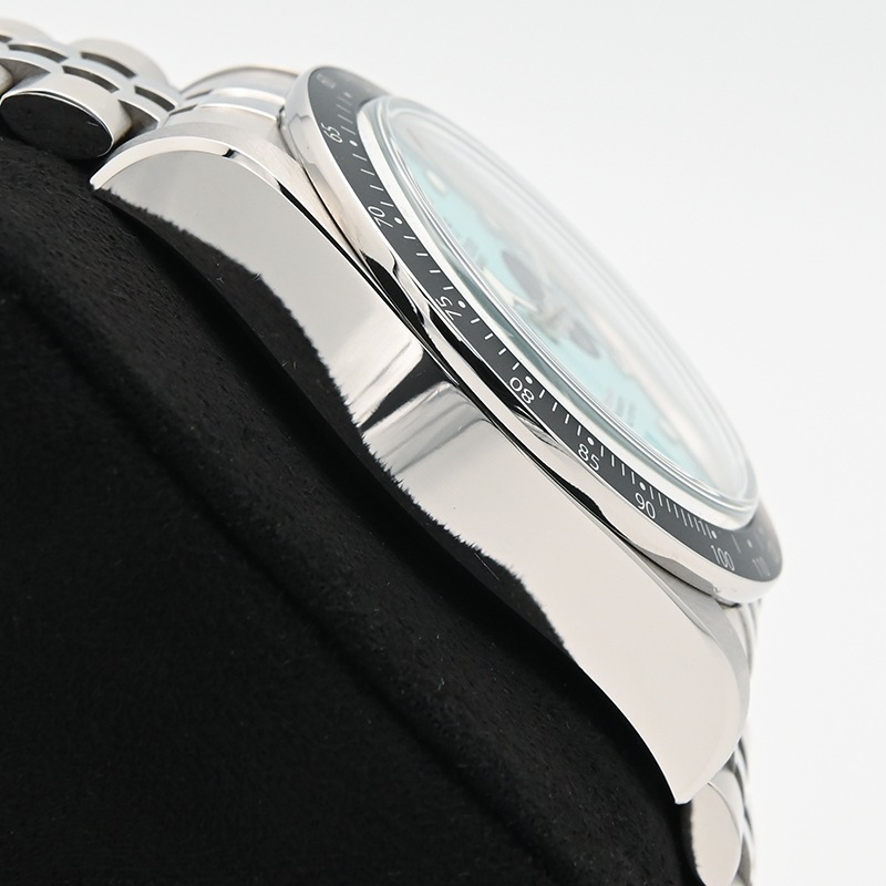 ケース径は41mm、アルマイト加工が施されたマットブラックのベゼルディスクに、ターコイズダイヤルに2つのブラックカウンターのコントラストが際立つ、市場の出回りも少ないレアモデルです。