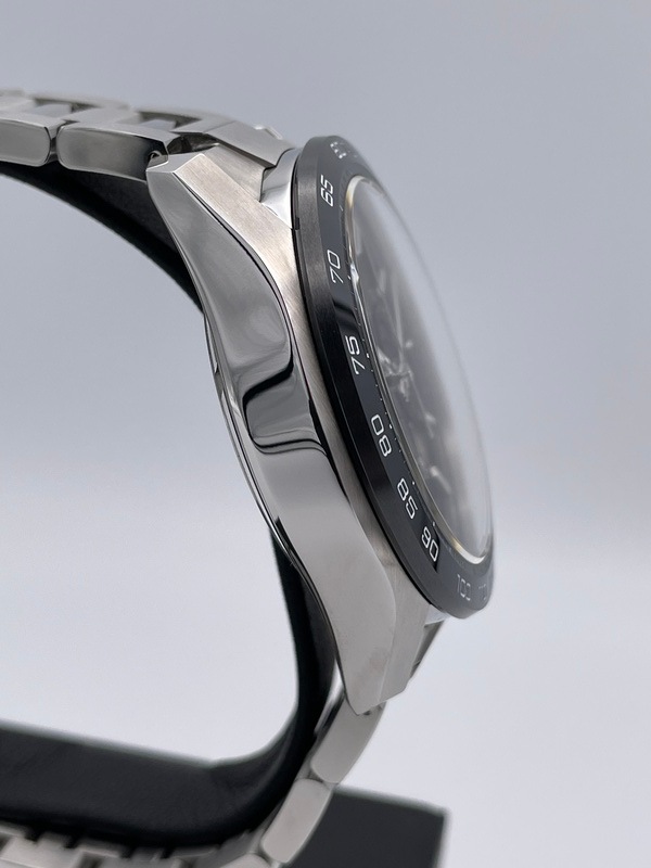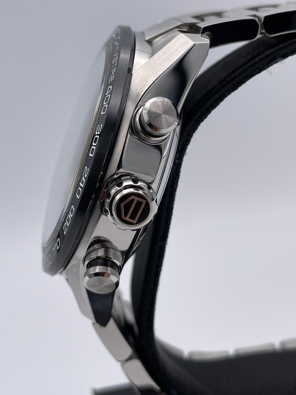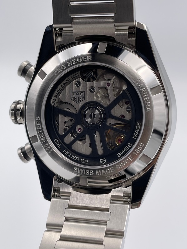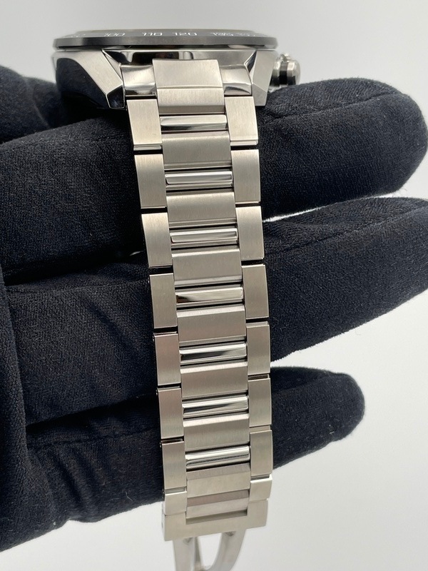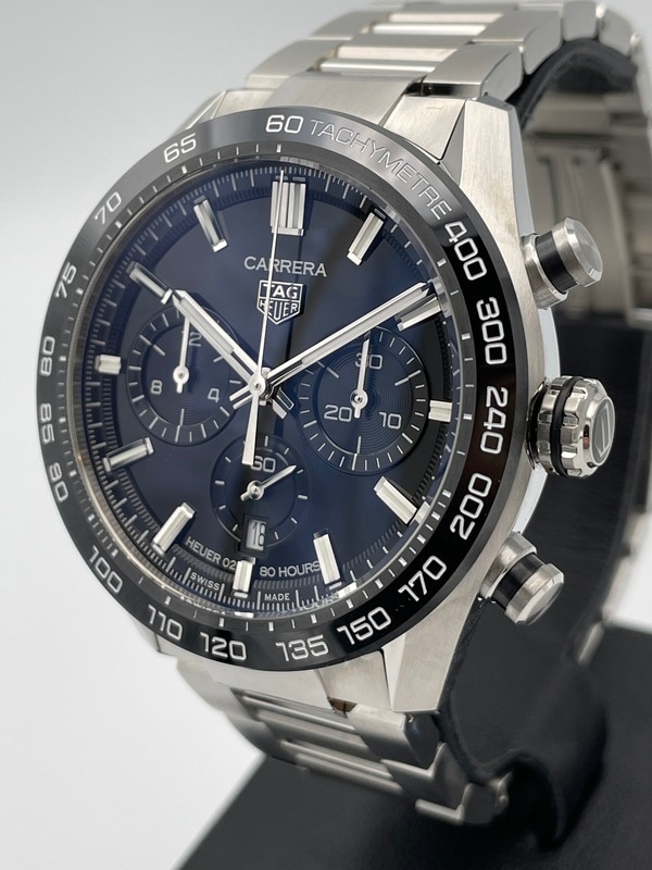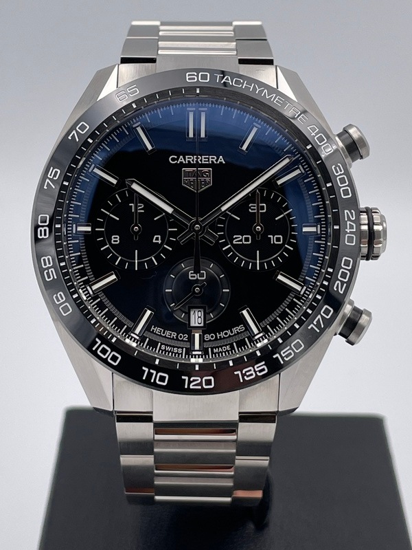 こちらは2020年に発表された新型の「カレラ」で、ポリッシュとサテン仕上げが交互に施された44ミリのステンレススティール製ケースに、ブラックセラミック製のタキメーターベゼルを採用。