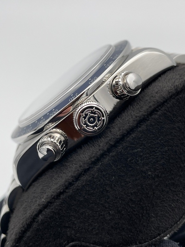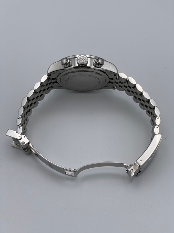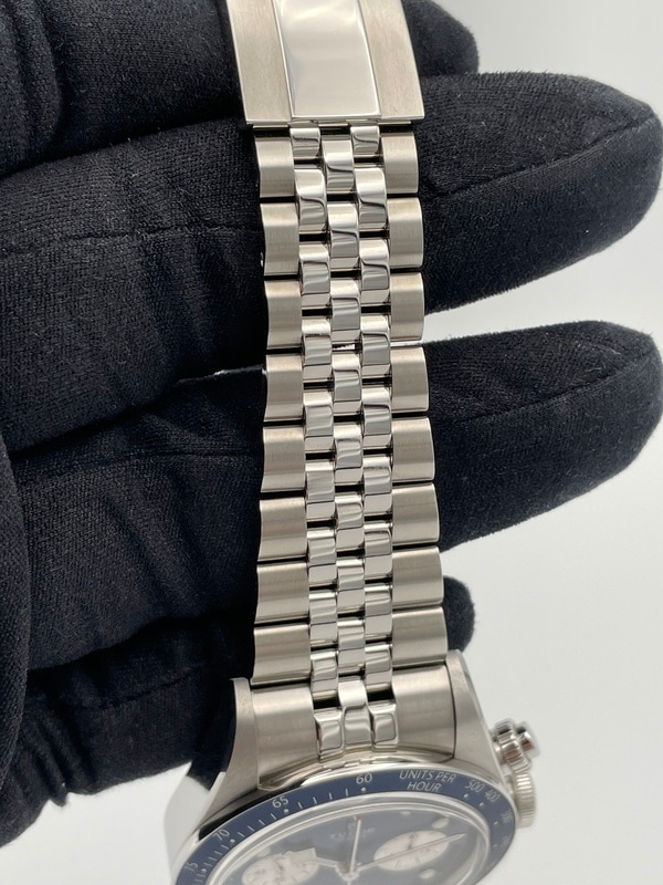 ケース径は41mm、アルマイト加工されたタキメーターべゼル備え、ダイヤル9時位置にスモールセコンド、3時位置に45分積算計を備えた2カウンターのクロノグラフで6時位置には日付表示も備えています。