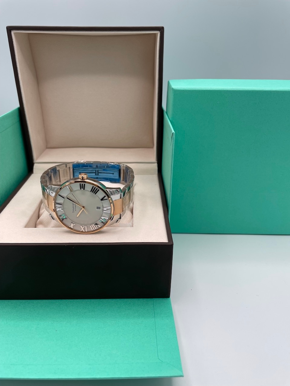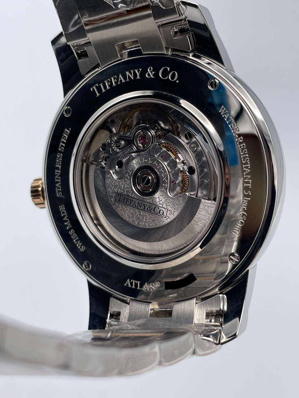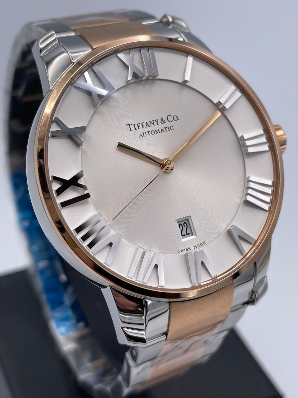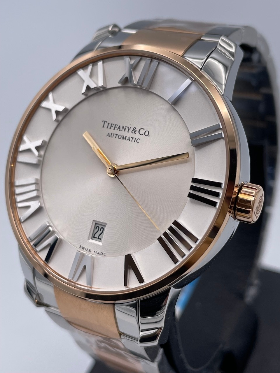 こちらはスッキリとしたシルバーダイヤルに、3針、ローマ数字のインデックス、6時位置に日付表示の小窓を備えたシンプルながらティファニーらしいエレガントなスタイルとなっています。