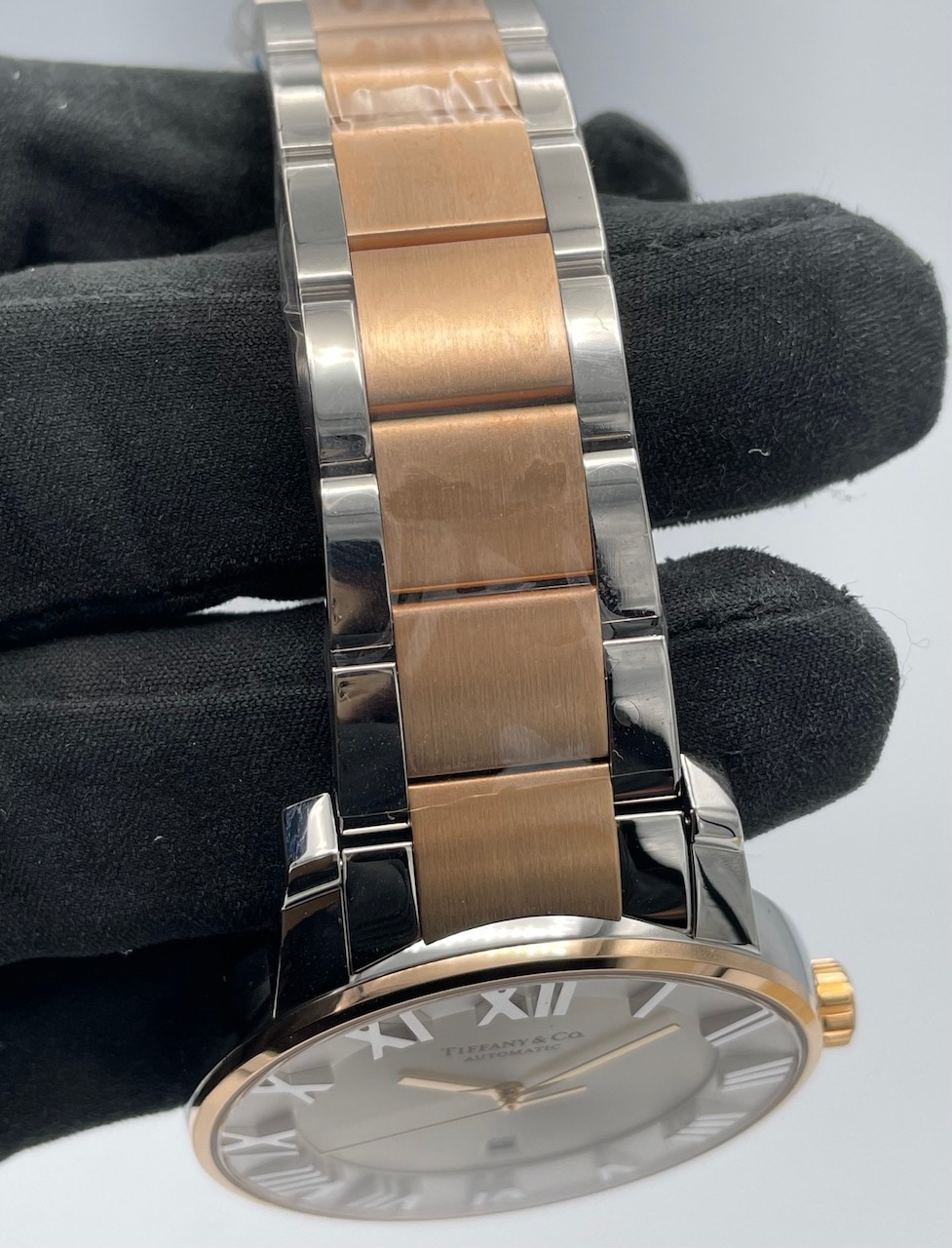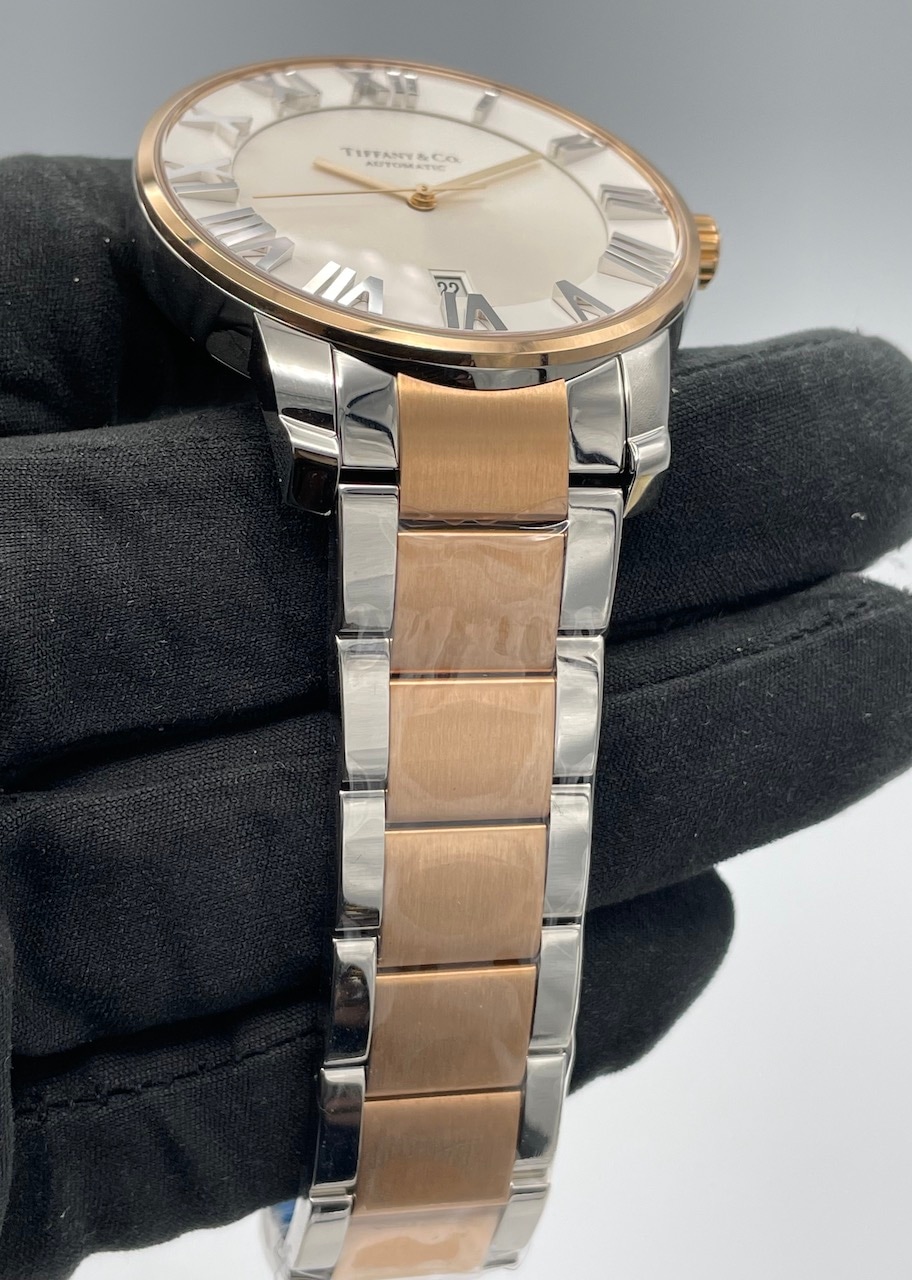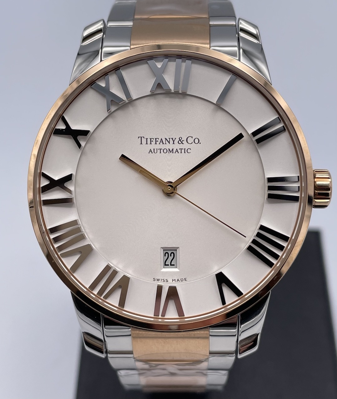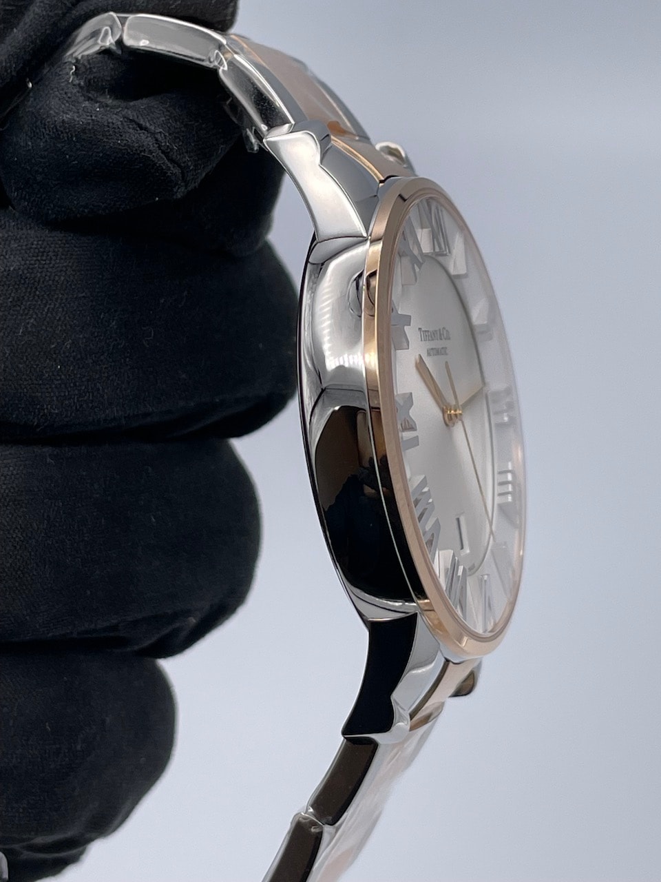 こちらはスッキリとしたシルバーダイヤルに、3針、ローマ数字のインデックス、6時位置に日付表示の小窓を備えたシンプルながらティファニーらしいエレガントなスタイルとなっています。
