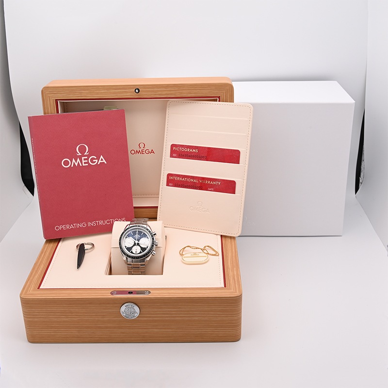 クル・ド・パリ装飾が施されたインダイヤルは通常のスピードマスターより大型化されており、3時位置に30分積算計、6時位置に12時間積算計と日付表示、9時位置にスモールセコンド秒針を備え、ムーブメントはSi14シリコン製ヒゲゼンマイを採用したフリースプラングテンプのCal.3330を搭載。