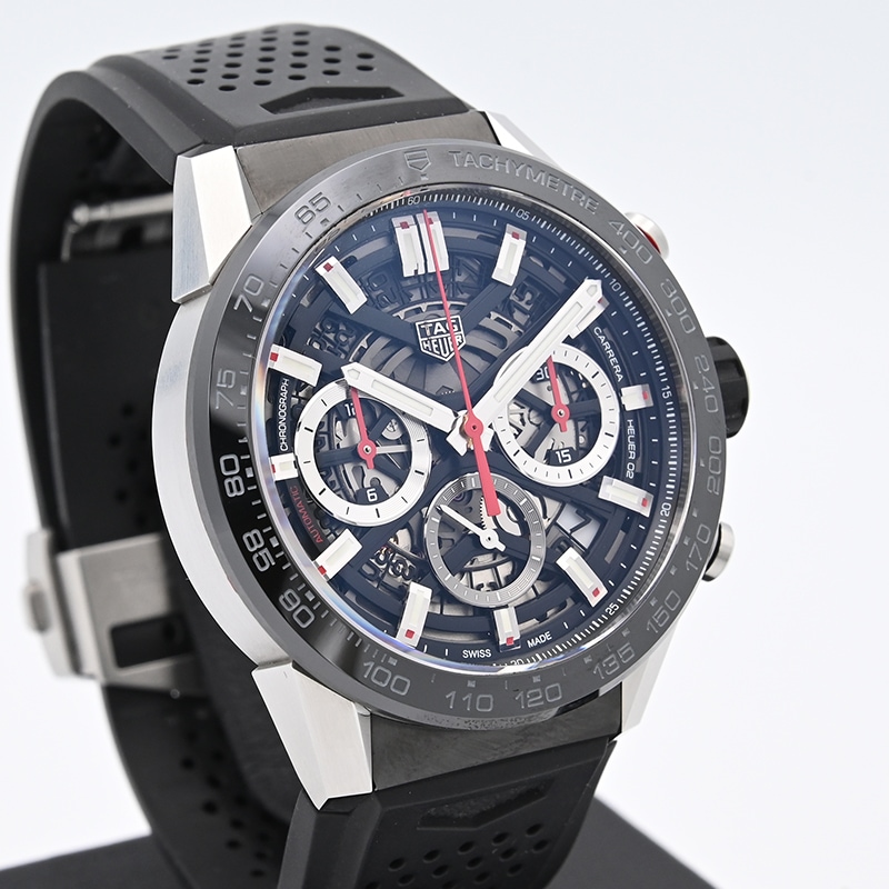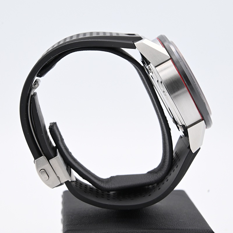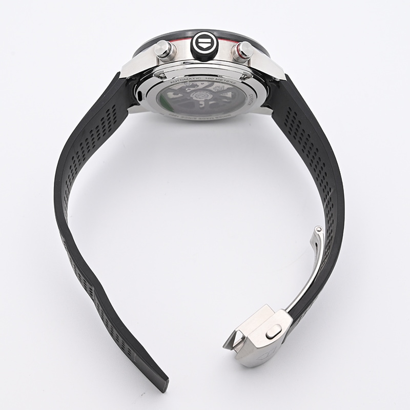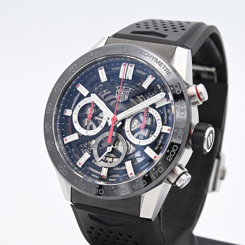 こちらはケース径43mm、オープンワークのスケルトンダイヤルに赤いクロノグラフ針を採用したスポーティなモデルとなります。