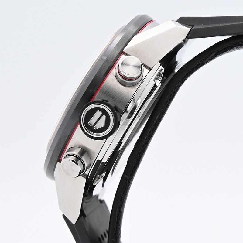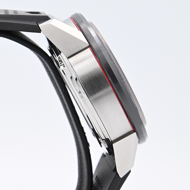 ベゼルはブラックのセラミック製で、ストラップはブラックのラバーストラップを採用。