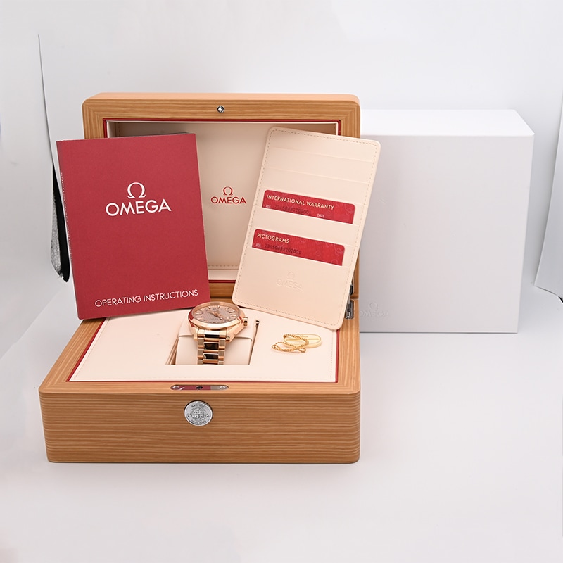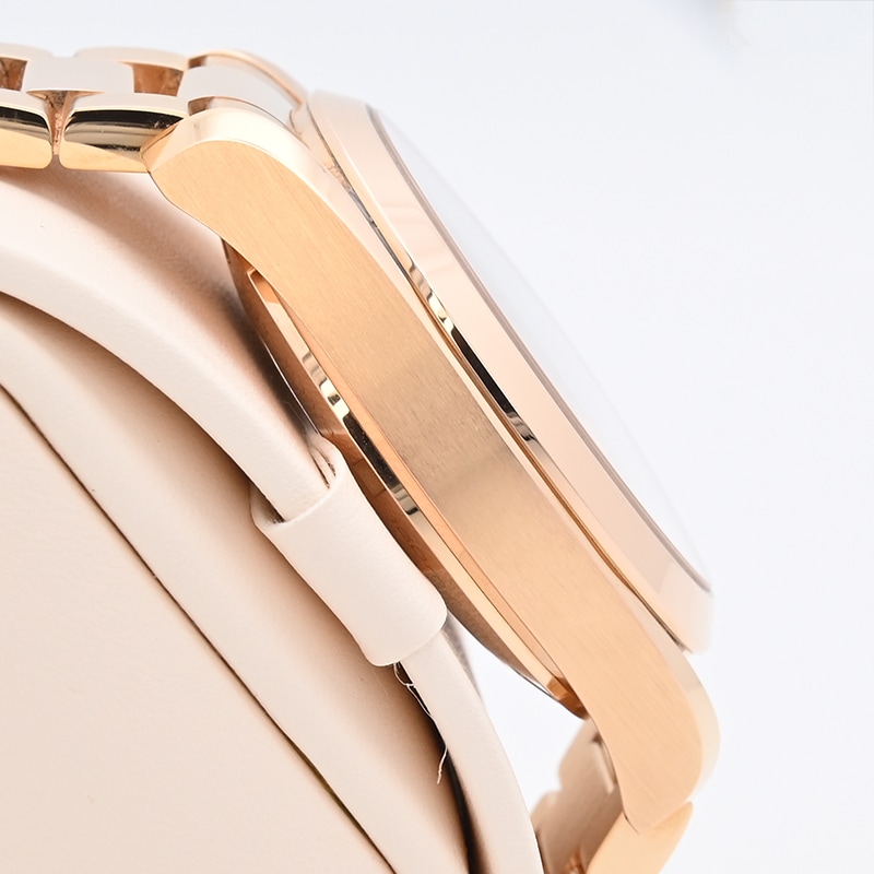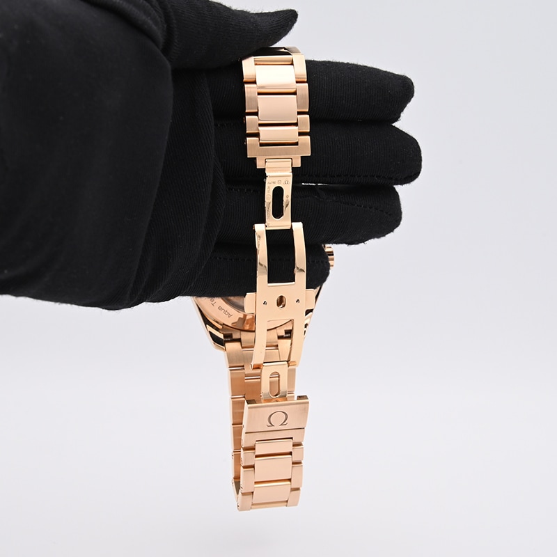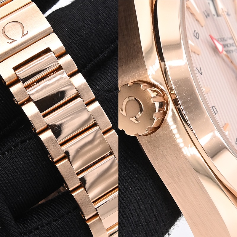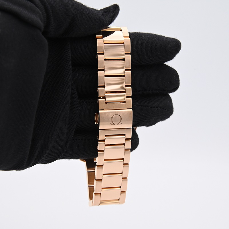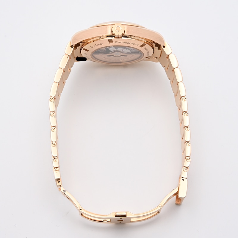 こちらはケース、ブレスレットともに18Kレッドゴールドを採用した金無垢モデルとなります。
