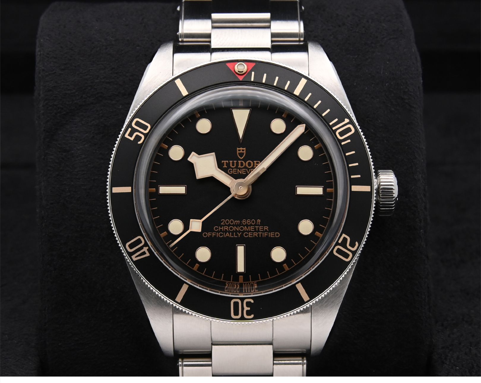 針、くさび形のインデックスには夜光塗料のスーパールミノヴァが塗布されており暗闇でも時間が読み取りやすくなっています。